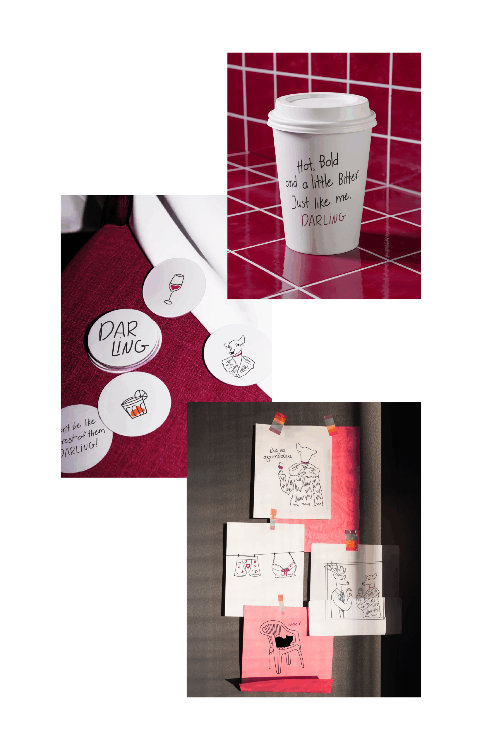 Το σύμβολο, εμπνευσμένο από το ελάφι της Ρόδου, αφηγείται οπτικά τη φιλοσοφία του Darling: έλα όπως είσαι, κάτσε άνετα, απόλαυσε τη στιγμή. Ένας χαρακτήρας που μεταφέρει συναίσθημα πριν ακόμη ειπωθεί η ιστορία.