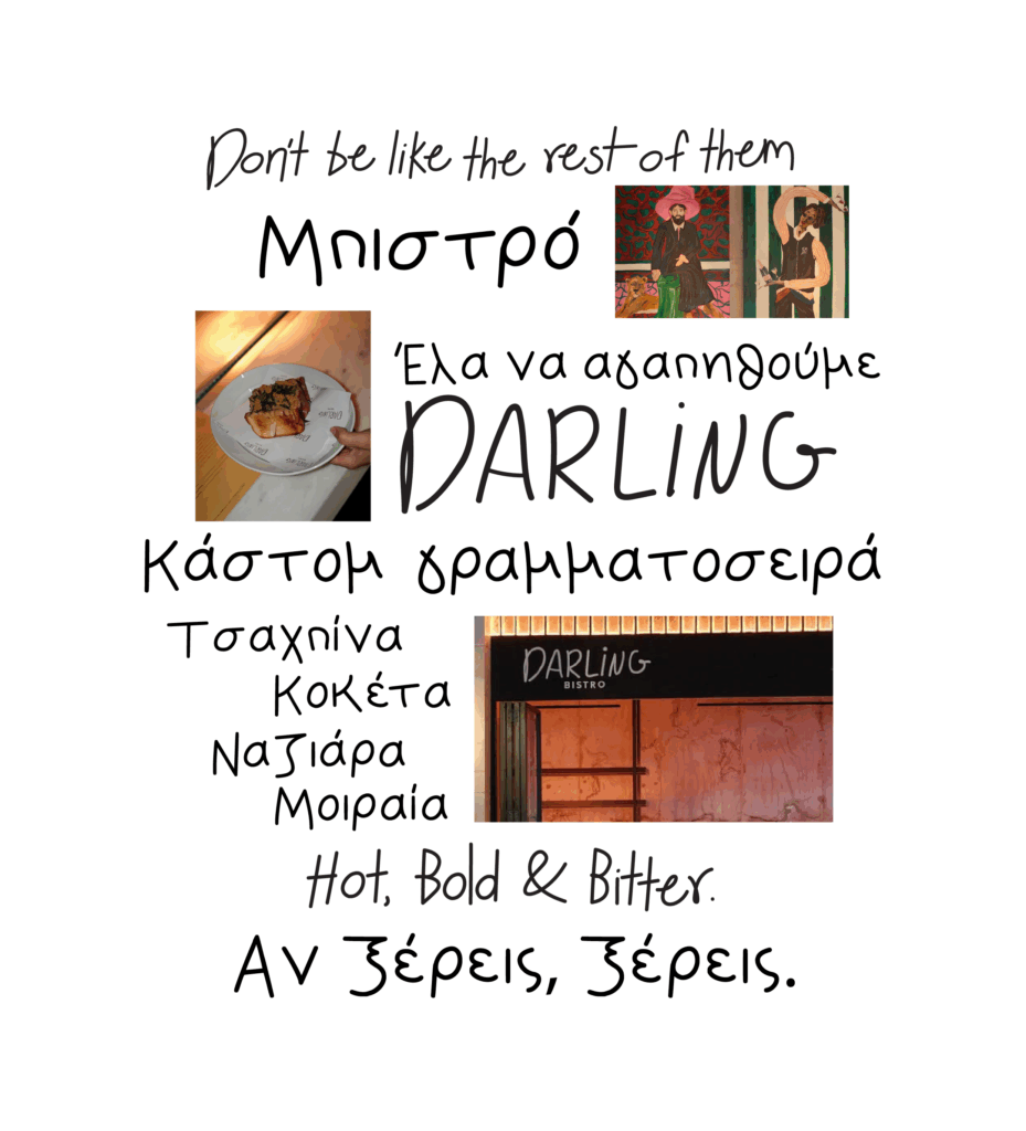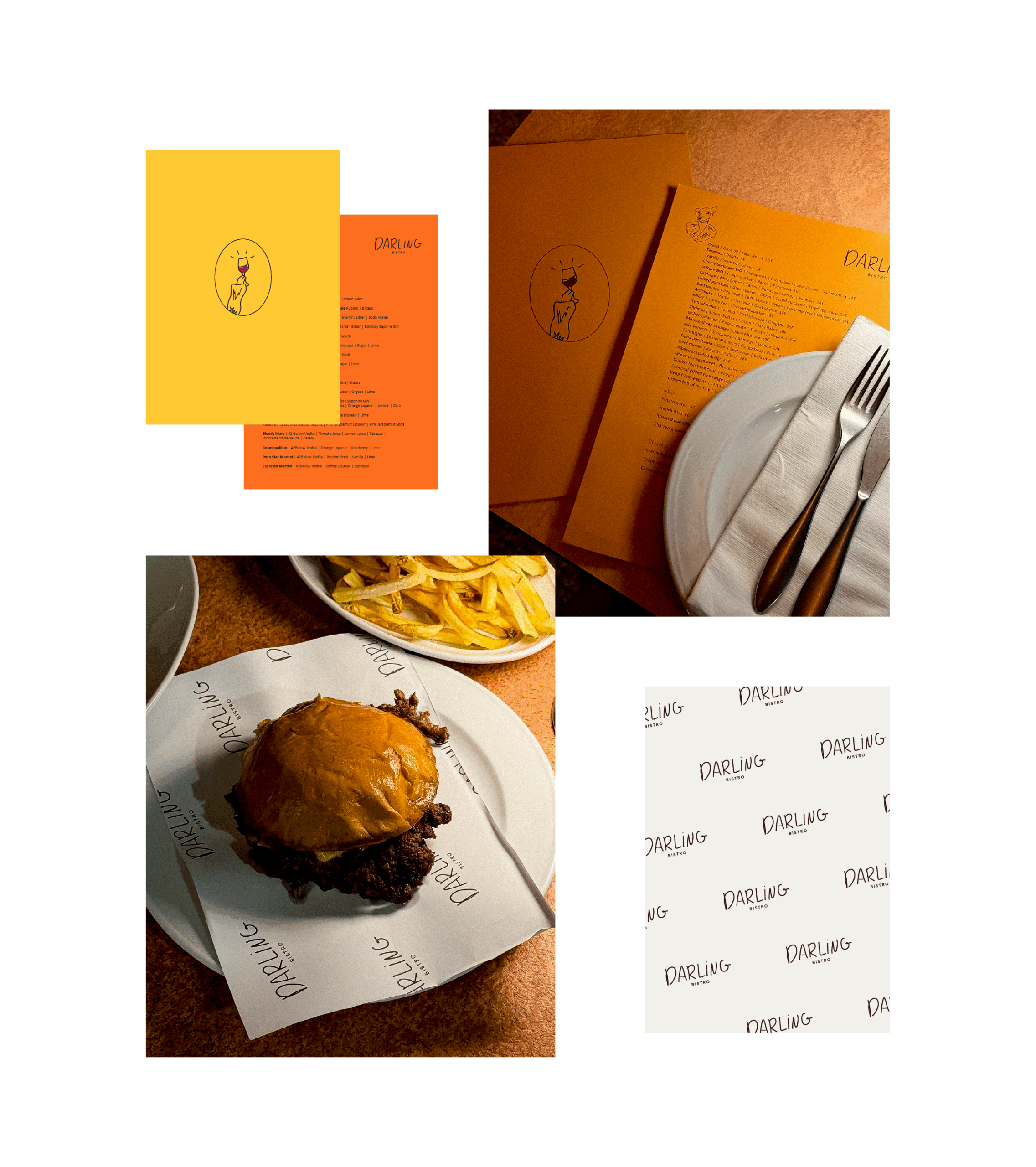 Το Darling σχεδιάστηκε ως ένα εστιατόριο με έντονη προσωπικότητα, χιούμορ και ανεμελιά. Ένα σύγχρονο bistro που απορρίπτει την επιτήδευση και δίνει έμφαση στη φιλοξενία, την αίσθηση της παρέας και τη χαλαρή απόλαυση της στιγμής.